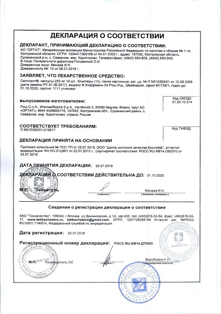 До начала лечения препаратом Селлсепт женщинам репродуктивного возраста следует пройти тест на беременность, чтобы исключить неумышленное действие микофенолата на эмбрион. Рекомендуется проведение двух тестов на беременность с сывороткой крови или мочой с чувствительностью не менее 25 мме/мл; второй тест нужно сделать через 8 – 10 дней после первого и непосредственно перед началом применения мофетила микофенолата. Тесты на беременность следует повторить, если это необходимо с клинической точки зрения (например, после сообщения о перерыв в контрацепции). Результаты всех тестов на беременность следует обсудить с пациентом. Пациентов следует проинструктировать о необходимости консультации с врачом немедленно после наступления беременности.