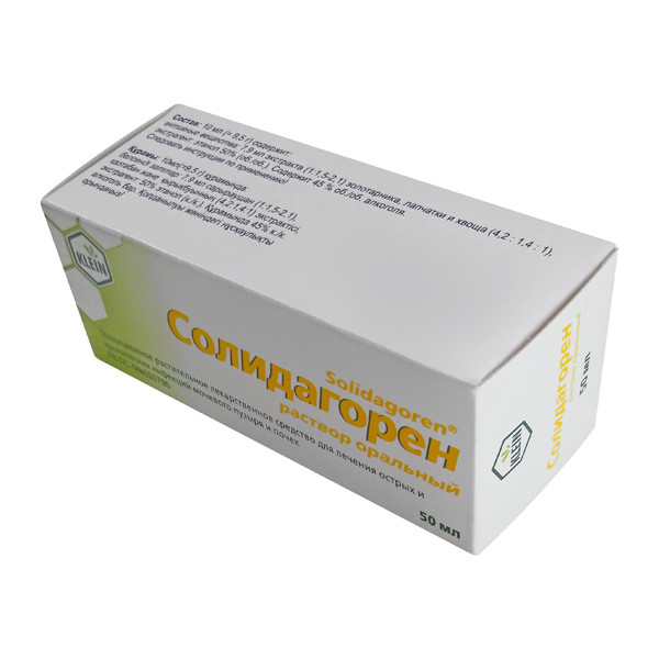 Солидагорен обладает мочегонным, противовоспалительным и антисептическим действием. Экстракты трав в составе способствуют уменьшению воспаления, нормализации работы почек и мочевыводящих путей, а также предотвращают образование камней.