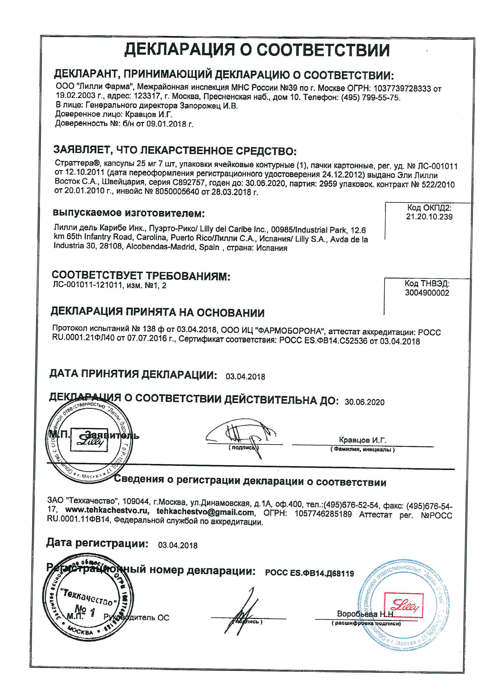 Лечим ребенка с СДВГ. Вот эта дозировка в 25 мг ему подходит лучше всего. Стал более усидчивым и спокойным, гуляем теперь спокойно. При занятиях увидела, что внимание концентрирует намного лучше. Но препарат только по назначению врача принимать и под его наблюдением, потому что у него много побочек. Хотя особого выбора нет – это единственный препарат при лечении СДВГ, который в нашей стране зарегистрирован. Заказываю в Артерия-Фарма. Очень понравилась фармацевт, которая перезванивала для уточнения всех нюансов. Она четко перечислила все другие препараты, которые нельзя одновременно со страттерой принимать. Когда получала заказ, потребовали предъявить рецепт, без него не отдали бы. Так что не забывайте рецепт дома.