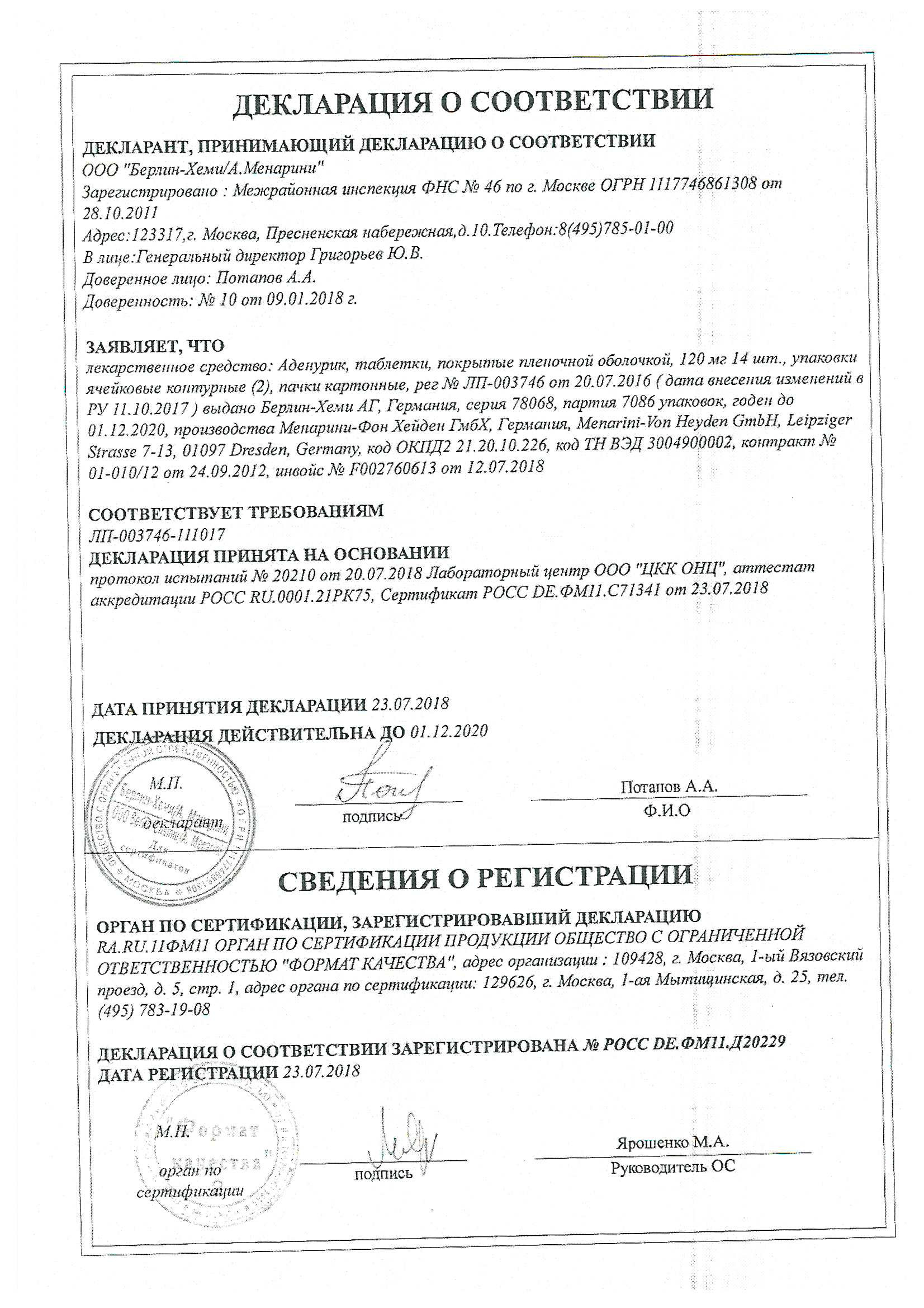 Дополнительные компоненты: моногидрат лактозы, микрокристалличесая целлюлоза, стеарат магния, гидроксипропилцеллюлоза, кроскармеллоза натрия, гидратированный коллоидный диоксид кремния.