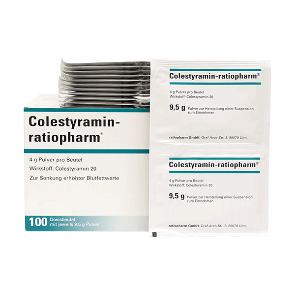 Холестирамин (Ратиофарм) является типом анионообменной смолы, который формируется при поступлении в кишечник особого комплекса с невсасываемыми желчными кислотами. Данное взаимодействие приводит к усиленному процессу выведения кислоты и желчи из организма человека, также уменьшает расщепление холестерина в кишечнике. Исследования показали, что в результате приема происходит уменьшение содержания беталипопротеинов и триглицеридов в крови пациентов.