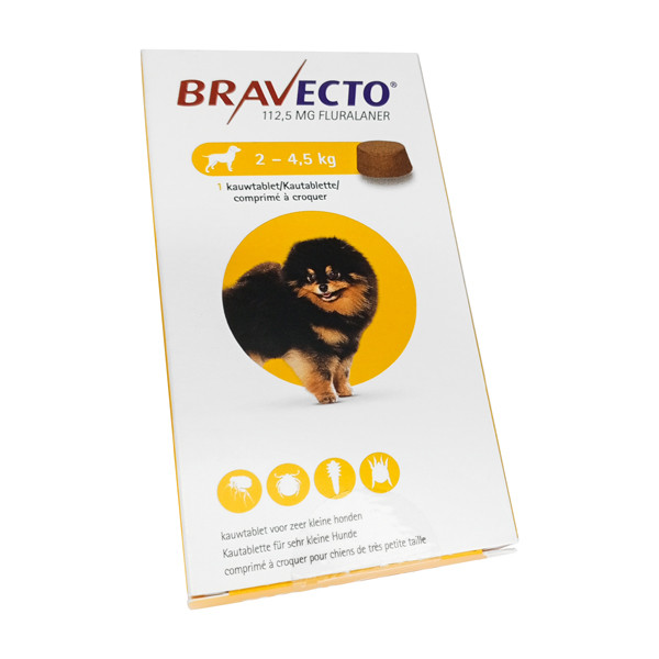 Для собак массой 2–4,5 кг используется 1 жевательная таблетка Бравекто 112,5 мг.