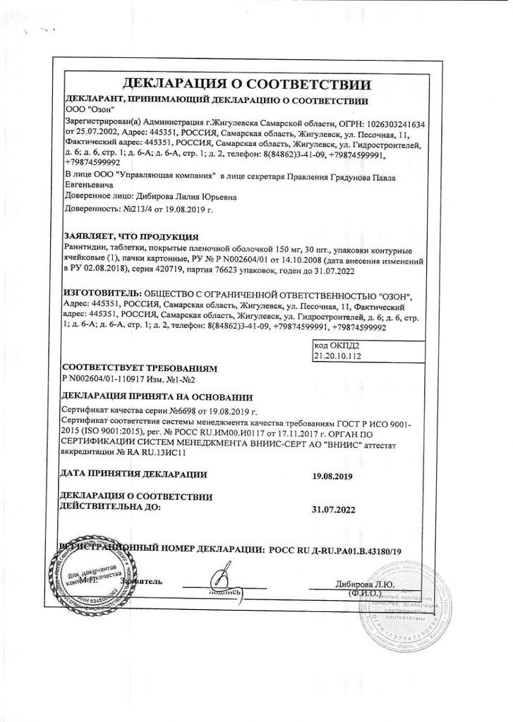 Основное активное вещество – ранитидин.